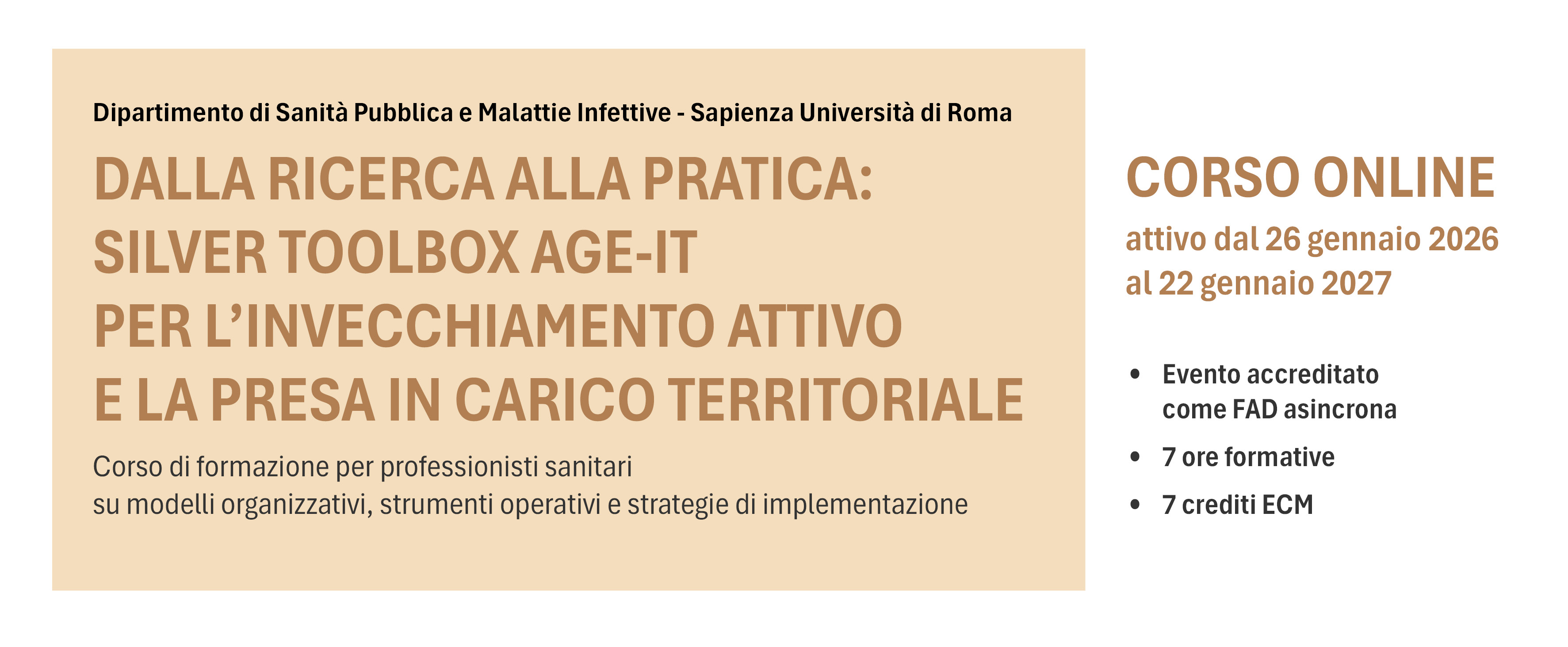 Il corso “Dalla ricerca alla pratica: Silver Toolbox Age-It” nasce per trasferire tali conoscenze nella quotidianità dei servizi sanitari.